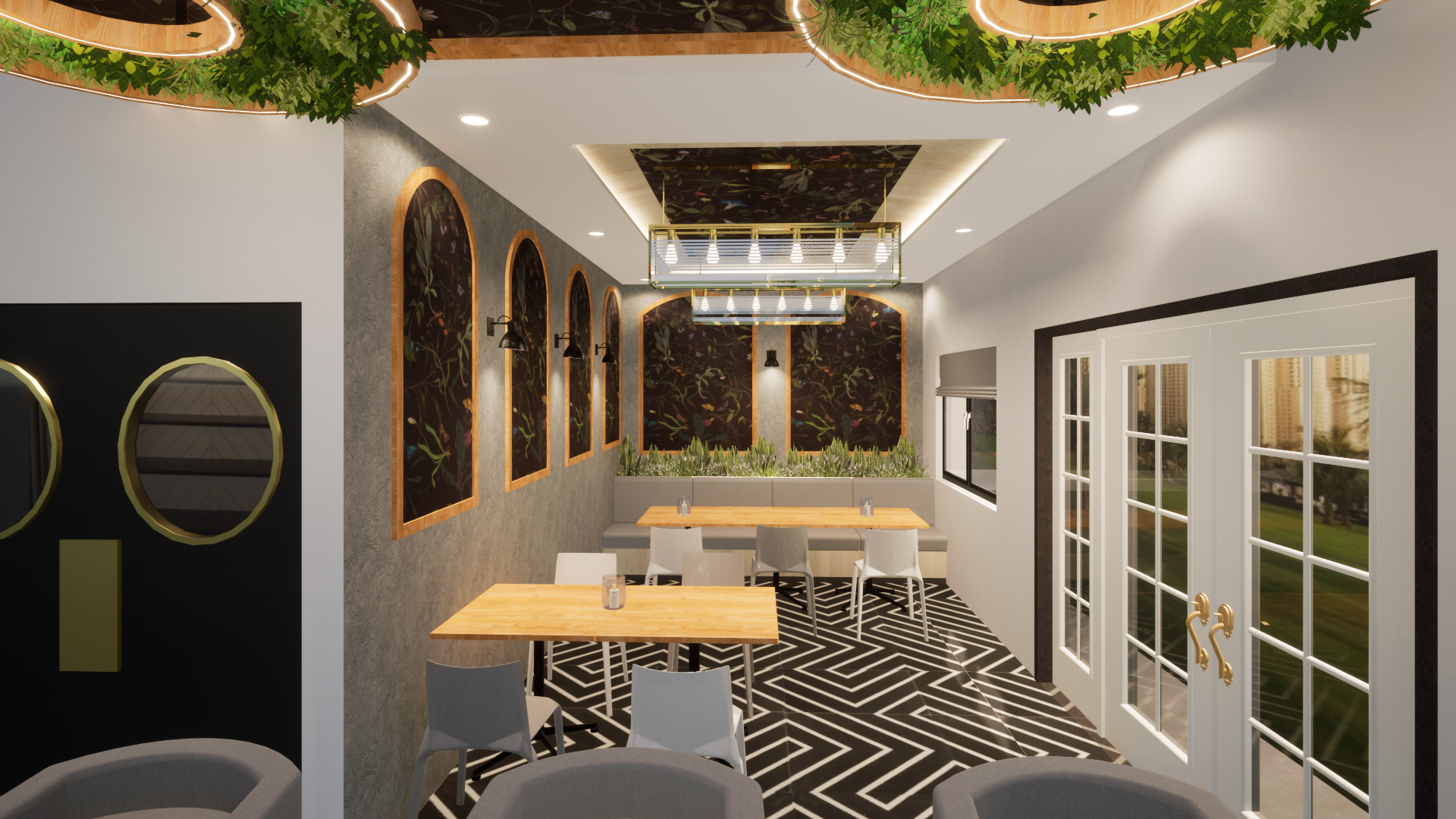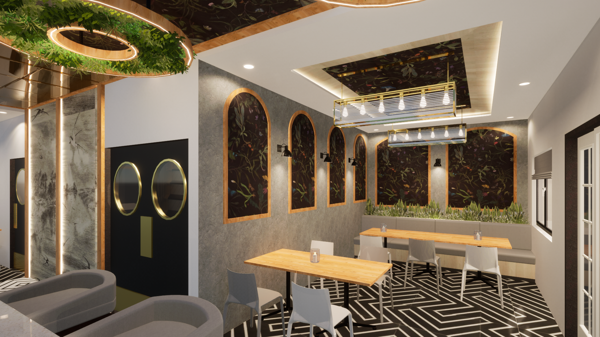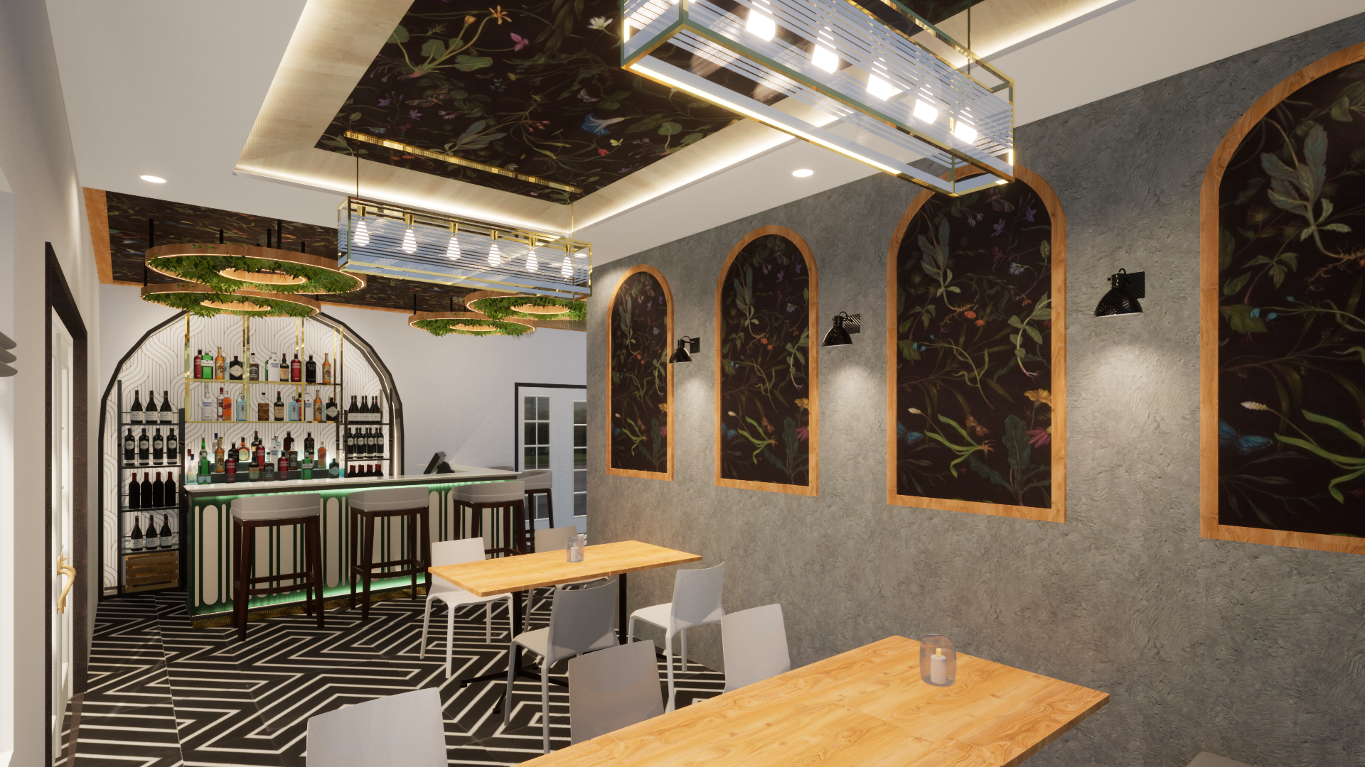 Designed a stylish 1000 sqft bar with a warm and inviting vibe! The entrance features a mirrored ceiling blending into wall panels with custom wallpaper. The lounge seating area has elegant arches, subtle wallpaper, and soft wall lighting for a cozy feel. The main highlight is the bar counter, featuring a hanging ceiling with artificial plants, a stunning arch shelf for bottle display, and LED profile lighting to enhance the theme and aesthetics. A perfect space to enjoy food, drinks, and great ambiance!