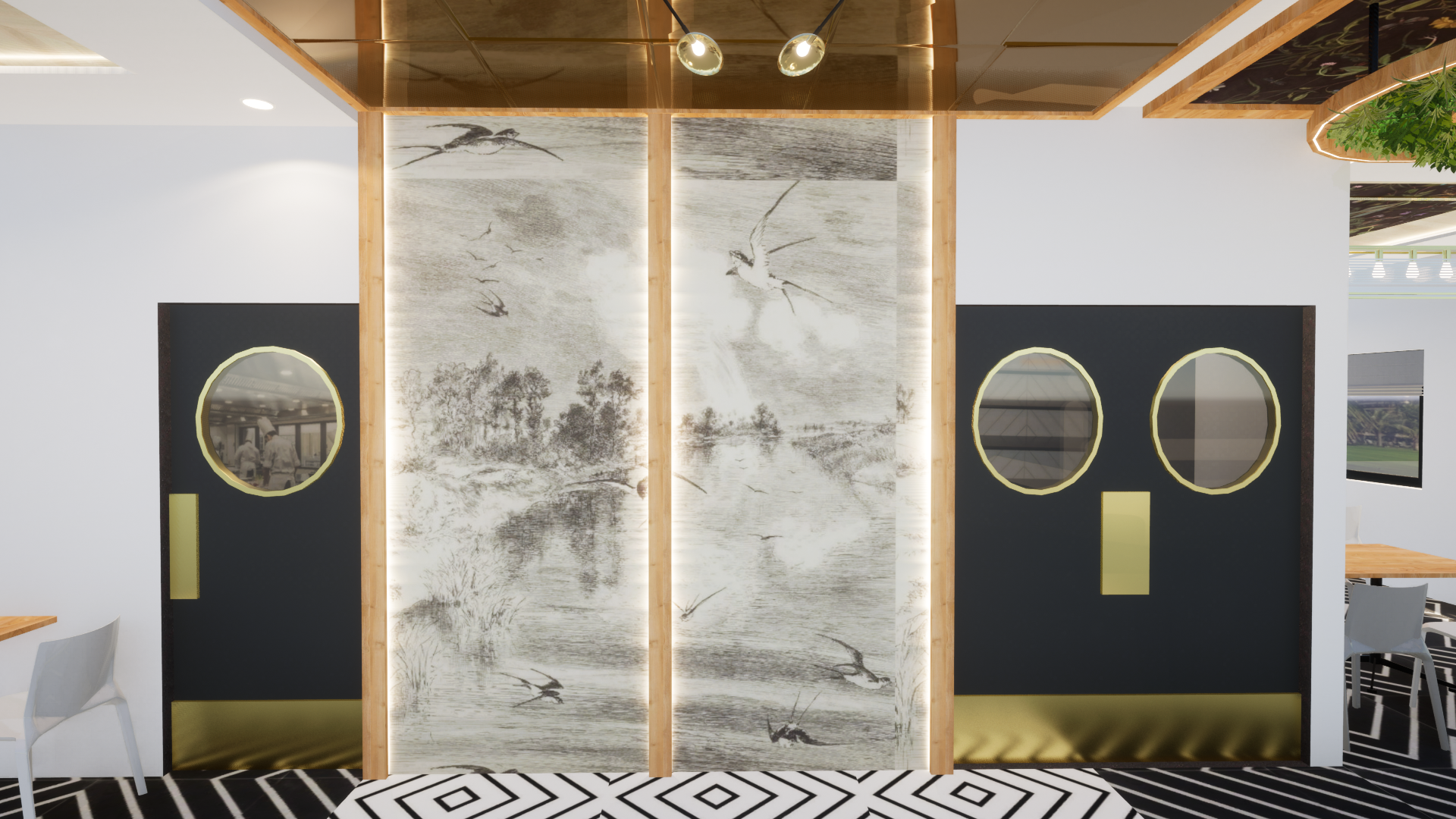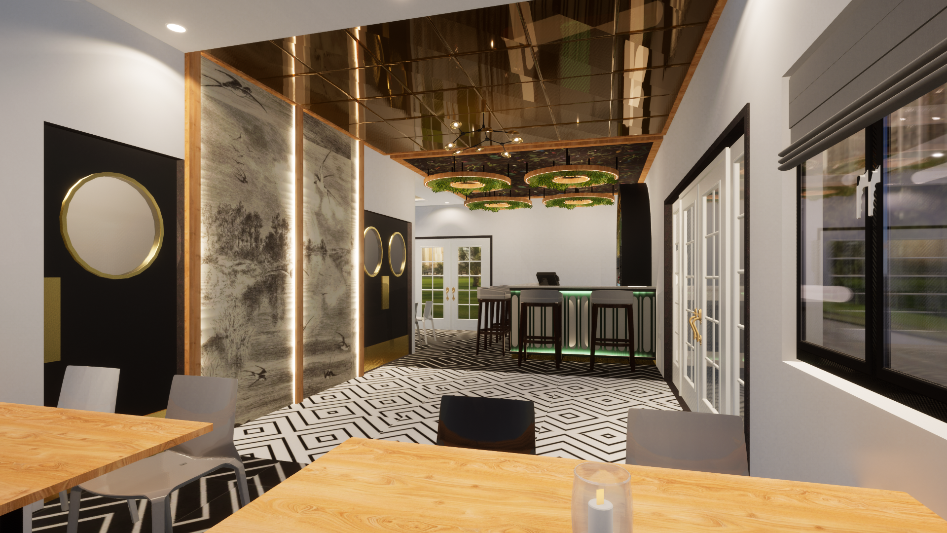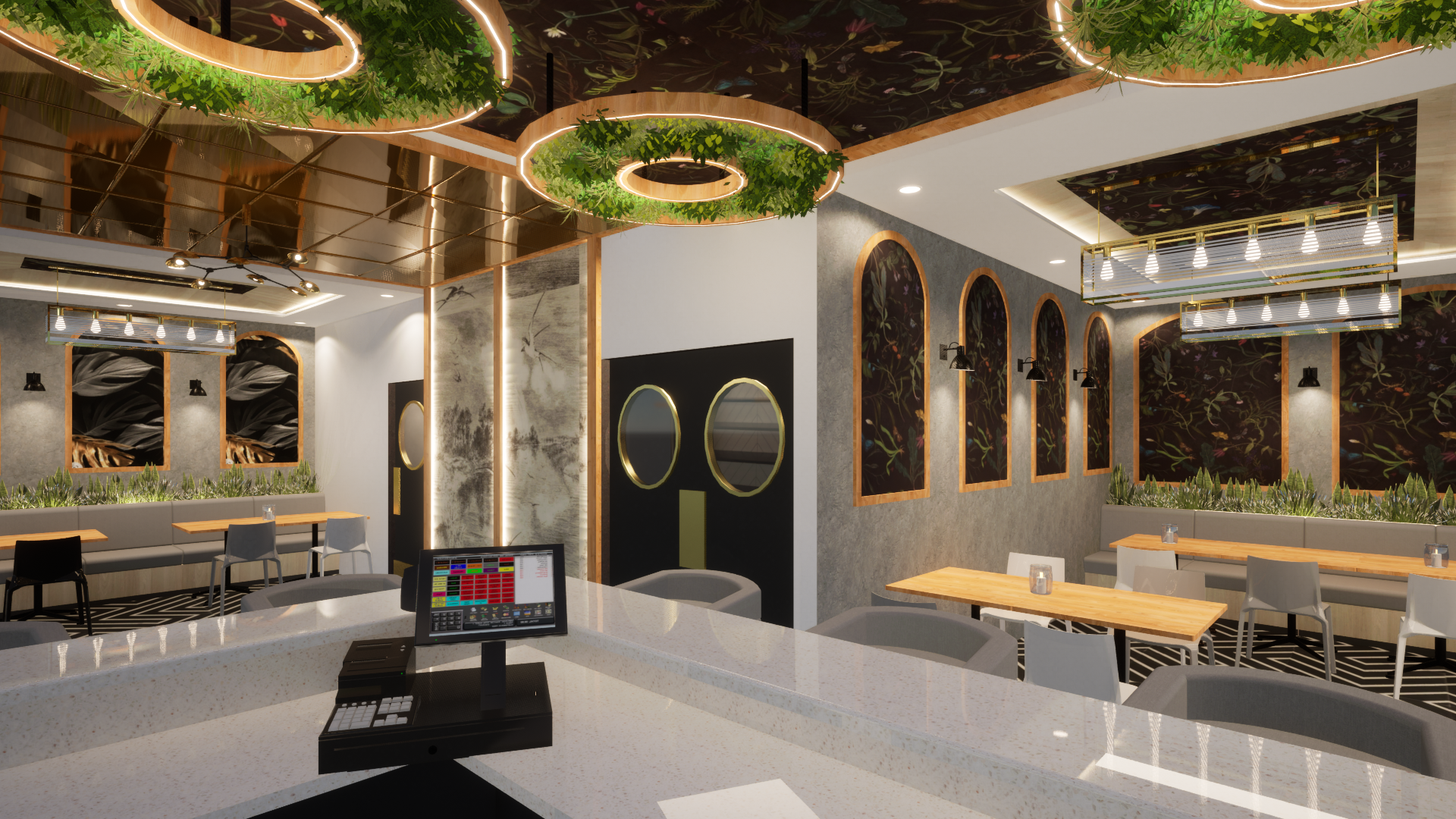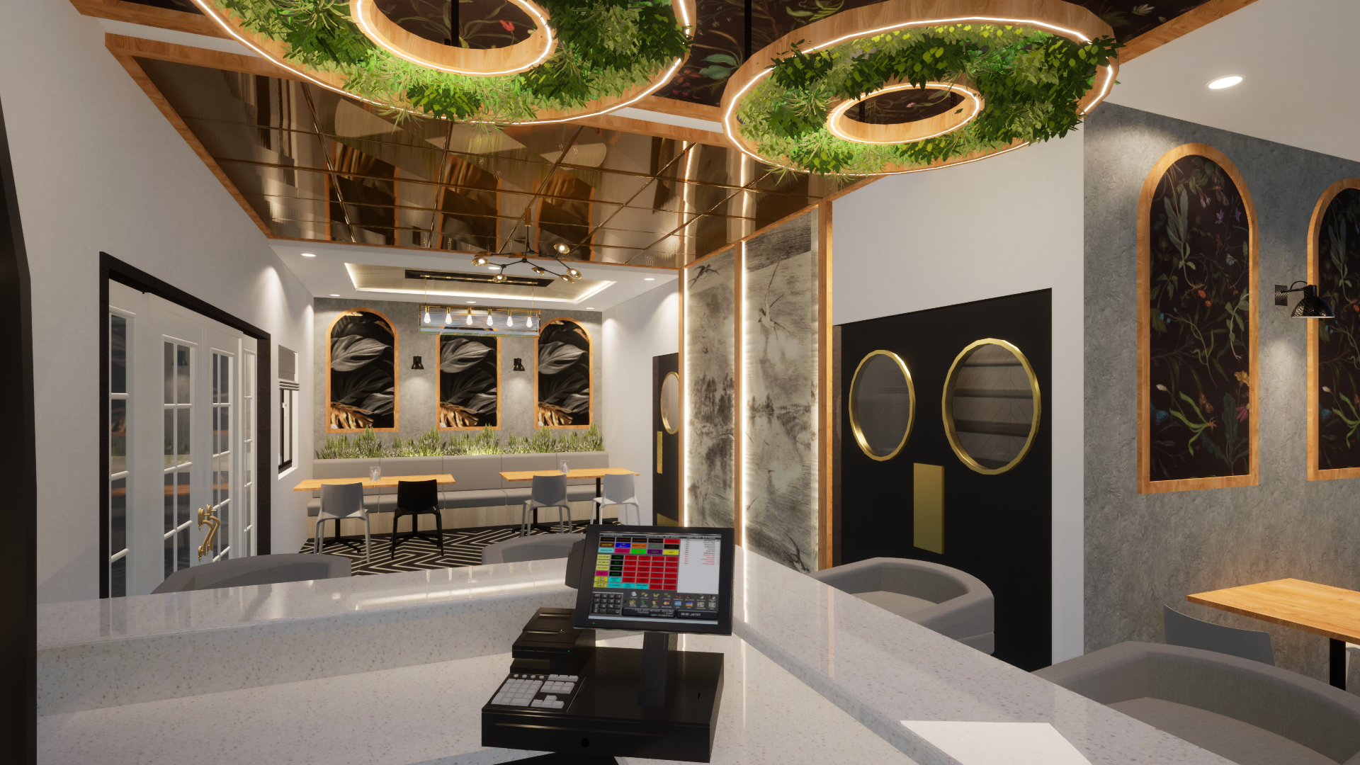 Designed a stylish 1000 sqft bar with a warm and inviting vibe! The entrance features a mirrored ceiling blending into wall panels with custom wallpaper. The lounge seating area has elegant arches, subtle wallpaper, and soft wall lighting for a cozy feel. The main highlight is the bar counter, featuring a hanging ceiling with artificial plants, a stunning arch shelf for bottle display, and LED profile lighting to enhance the theme and aesthetics. A perfect space to enjoy food, drinks, and great ambiance!