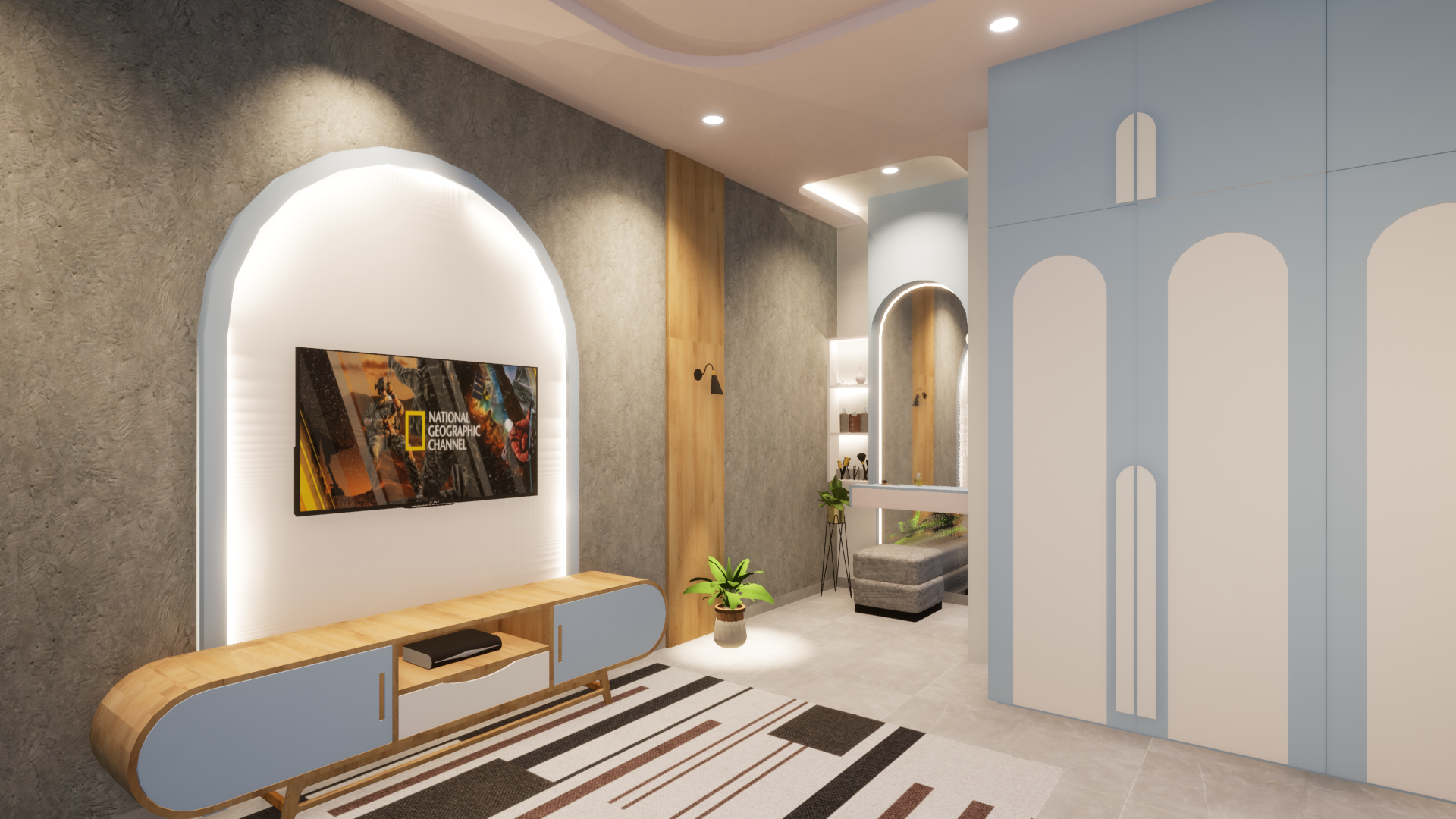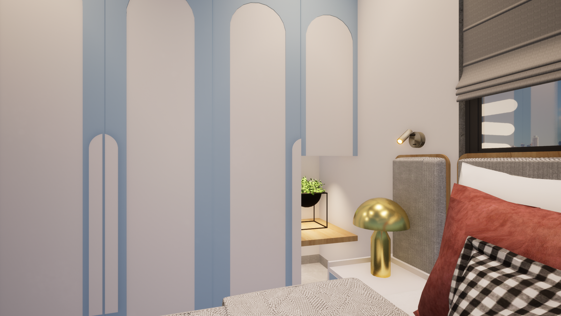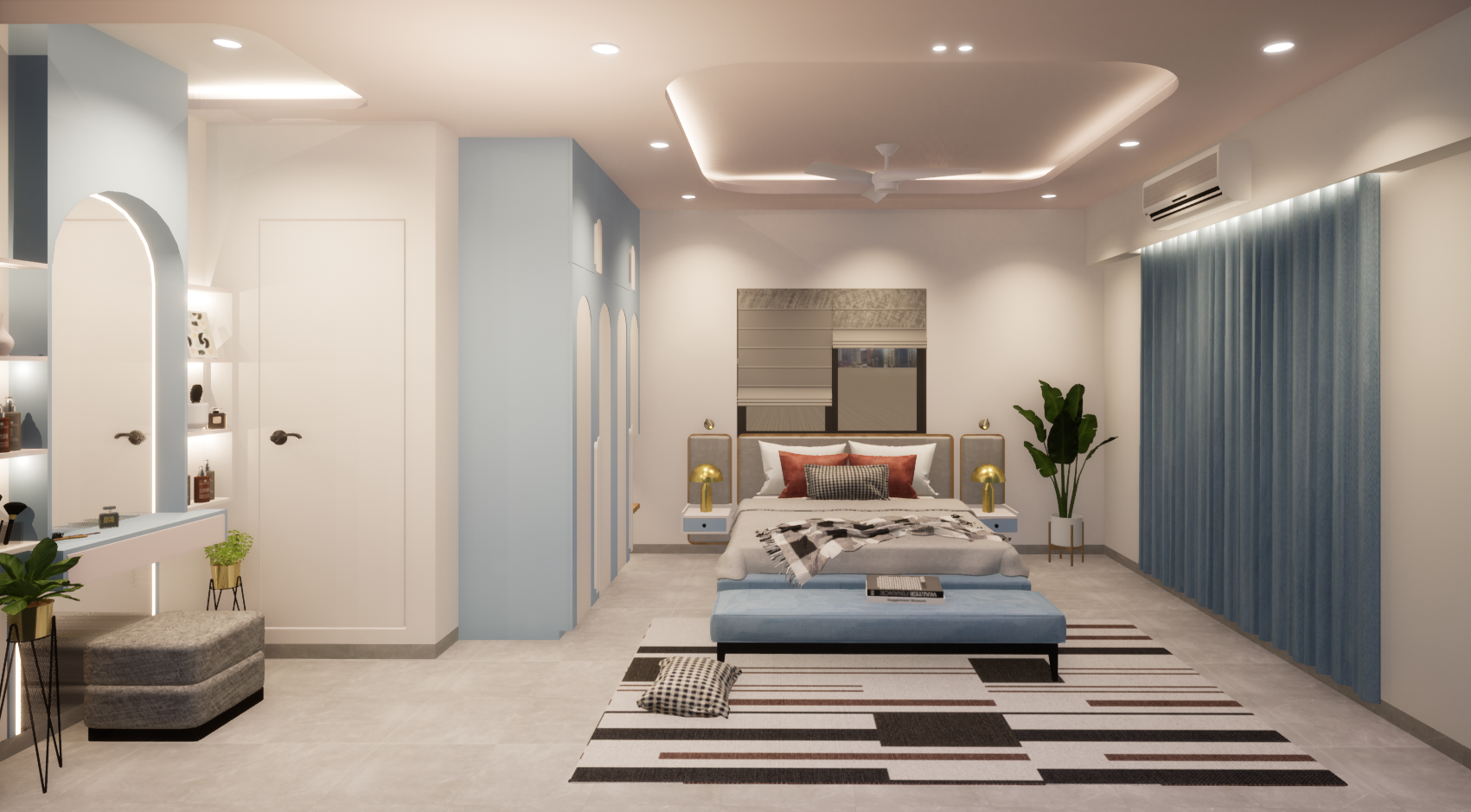 Soft pastel colors bring a calm and soothing vibe to the bedroom in our Gadchiroli residence project, creating a perfect retreat for relaxation.
